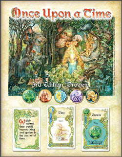 Once Upon a Time is the award-winning storytelling card game that encourages creativity and collaborative play. Once player is the Storyteller, and beings telling a story using the fairy tale elements on her Story cards, guiding the plot toward her Ending Card. The other players use their own cards to interrupt her and become the new Storyteller. The winner is the first player to use all her Story Cards and play her Ending Card. The object of the game, though, is not so much to win as to have fun creating a story together. Once Upon a Time 2nd Edition was named to GAMES Magazine's Best Family Card Game section in 1997. The 3rd Edition features:New Artwork: Entirely new artwork by fantasy artist extraordinaire Omar Rayyan, known for his work for Magic: The Gathering and his amazing children's books.Revised Cardlist: A re-worked cardlist designed to make play smooth and easy.Redesigned Box: A larger box with new graphic design and "book-like" front flap, for greater visiblity and shelf presence, with room inside for storing future expansion decksSimplified Rulesheet: A simplified rules sheet designed to bring new players quickly into the game.Designers: Richard Lambert, Andrew Rilstone, and James Wallis Editor: Michelle Nephew Cover and Card Artist: Omar Rayyan | ISBN: 1-58978-131-7 | Format: 110 Story Cards, 55 Ending Cards,and a rulesheet in a 6.25" x 1.75" x 9" box